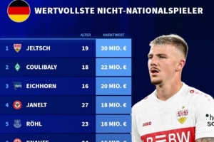 體育資訊3月24日訊 德國轉會市場統計了從未入選德國隊名單的球員身價,并列出榜單。