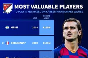 美職聯球星巔峰身價榜:梅西1.8億歐居首,格列茲曼1.5億歐第二