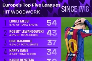 2017-18賽季以來五大聯賽球員射門中柱次數:梅西領跑,萊萬第二