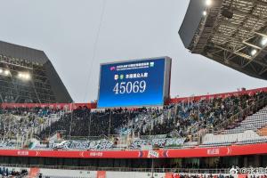 體育資訊03月14日訊 中超第2輪,山東泰山主場對陣北京國安的比賽正在進行?,F場大屏幕顯示,本場比賽的到場人數為45069人。