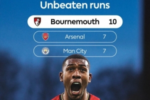 英超官方數據統計顯示,伯恩茅斯的10場不敗是目前英超最長,阿森納和曼城都是7場不敗。
