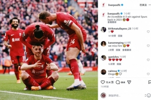 利物浦官方社媒曬出若塔那場比賽慶祝進球的照片,緬懷這位去世的前鋒,配文:“2023年那場不可思議的4-3擊敗熱刺的比賽。”