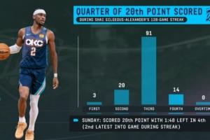 上一場比賽,在第四節(jié)還剩1分48秒時拿到第20分(為連續(xù)得分紀(jì)錄期間,單場拿到20分時間點(diǎn)第二晚的比賽)