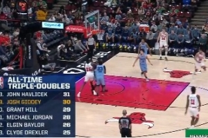 公牛球員吉迪已經拿到13分10籃板10助攻的三雙數據,這是他生涯第30個三雙,他超越格蘭特·希爾,獨占三雙歷史總榜第十九位。