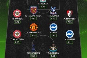 中場:瓦塔拉(布倫特福德)、B費(曼聯)、格羅斯(布萊頓)、明特(布萊頓)