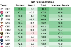 體育資訊3月17日訊 今天,數據分析師Dean Oliver統計了本賽季聯盟各隊首發陣容和替補陣容的凈效率(百回合凈勝分)。