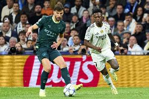 體育資訊3月18日訊 歐冠1/8決賽次回合,皇馬客戰曼城,維尼修斯在比賽上半場點射破門。