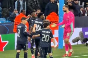 維尼修斯補時上演梅開二度后,對著球迷展示球衣。隨后曼城門將多納魯馬攤手與其溝通表達不滿。