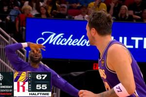 GIF-東契奇快攻上籃 詹姆斯開嘲諷 東契奇比了個2:都是2分嘛!