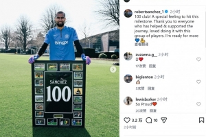 桑切斯社媒曬出與百場里程碑紀念品的合照,配文:“100場比賽!達成這一里程碑的感覺真特別,感謝一路上給予幫助和支持的每個人,喜歡與這群隊友并肩作戰的感覺,我已準備好迎來更多比賽。”